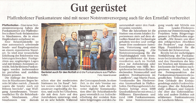 Ertüchtigung der Anlage für Notstrom: Artikel im Pfaffenhofener Kurier vom 14.09.2023: